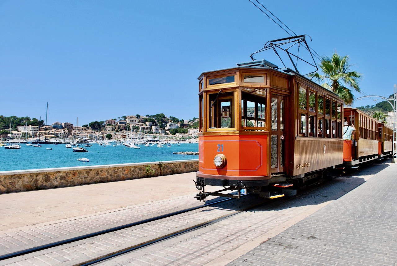 … liegt nordwestlich am Fusse der Serra de Tramuntana und ist ein Ortsteil vom rund vierzig Meter höher gelegenen Städtchen Sóller. Das „Sóller-Bähnchen“- im San Francisco-Stil – tuckert und ruckelt im Halbstundentakt, die sieben Kilometer lange Strecke zwischen Puerto de Sóller und Sóller – Stadt, rauf und runter.
