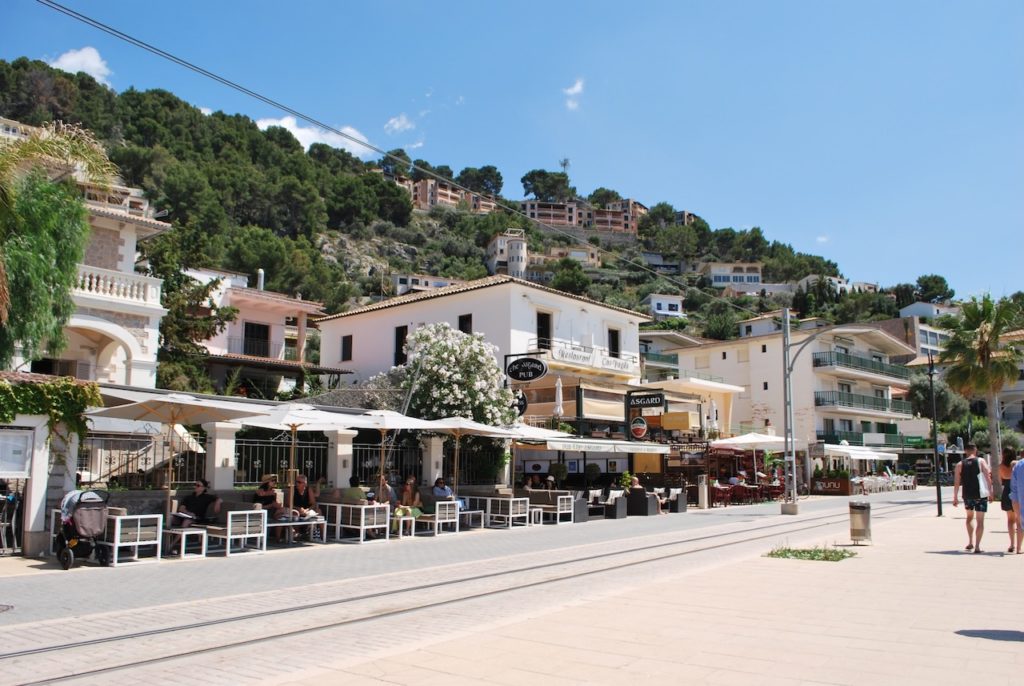 … mit Sicht zur gegenüberliegenden „Marina Tramontana“ und zur „Ctra. Port de Sóller“ mit Bahntrasse und ebenfalls mehreren Restaurants.