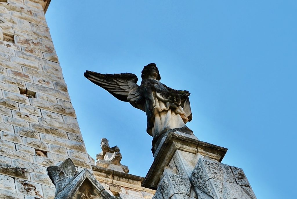 Zwei Engel, je einer auf einer Säule stehend flankieren das Eingangsportal.