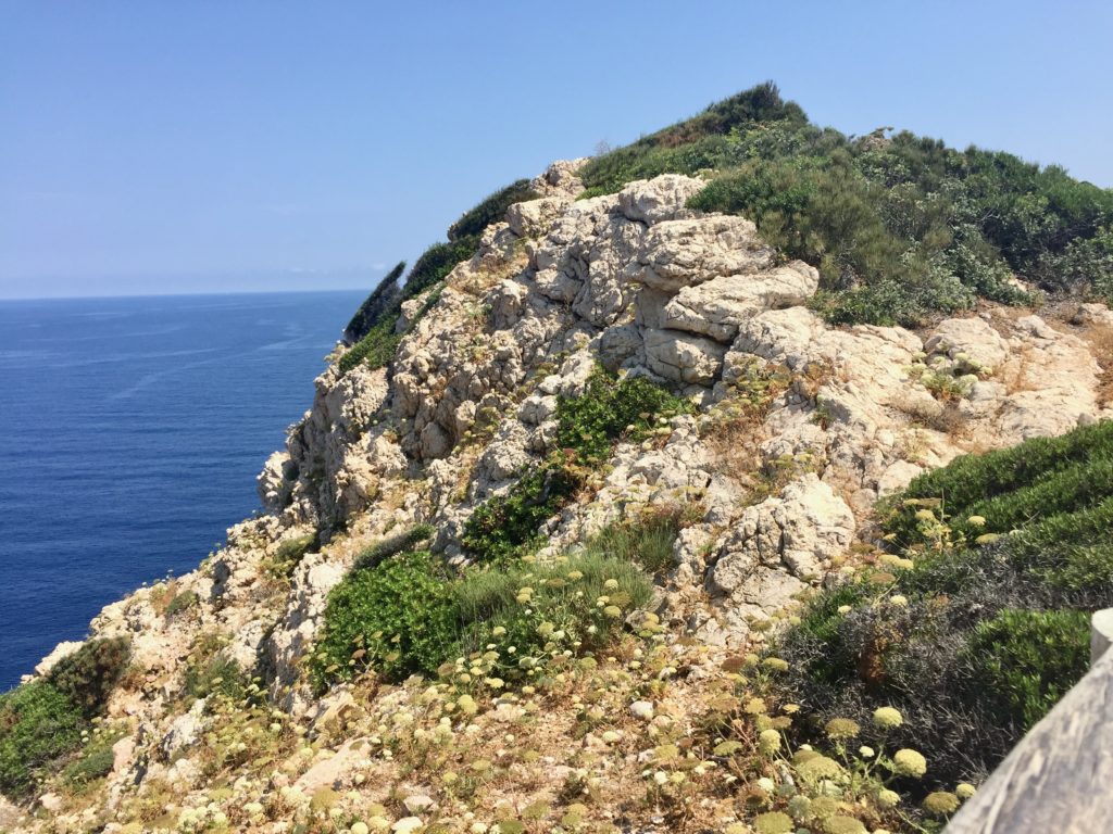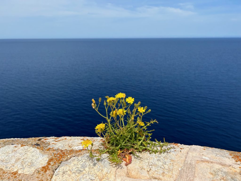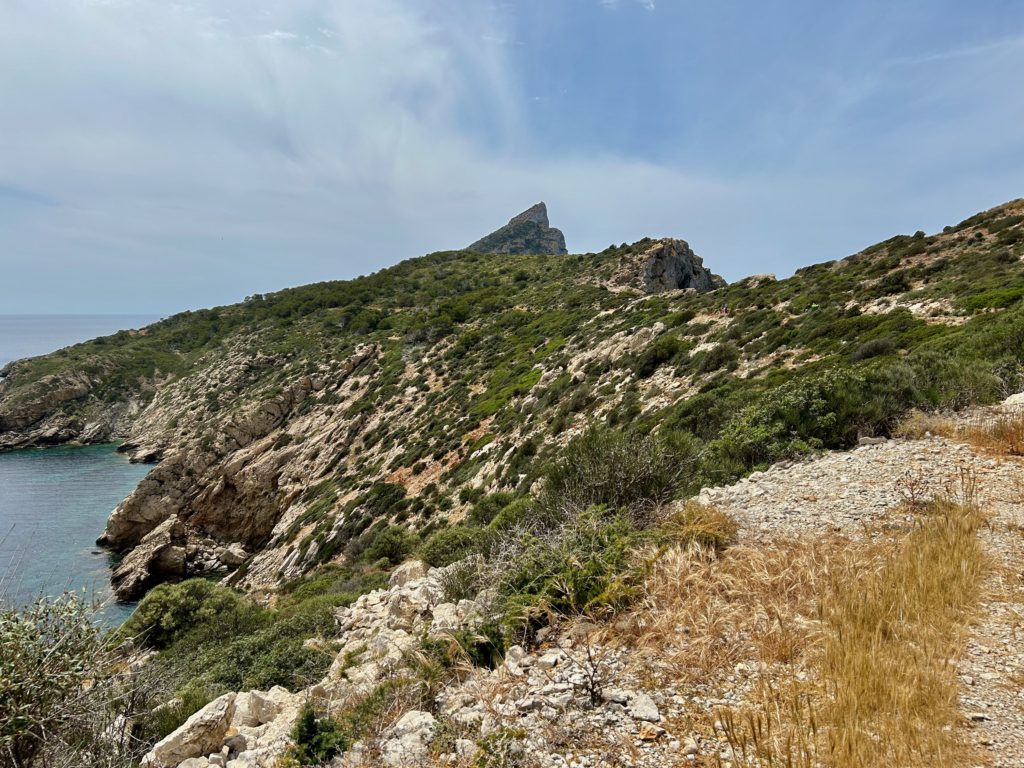 … oder natürlich zum höchsten Punkt der Insel, dem „Pico Popi“ oder „Mirador de Sa Trona“. Da hinauf kann man nur mit festen Bergschuhen wandern. Was heisst wandern: Geröll, Felsformationen und das kurvenreiche Train verlangen Konzentration und Trittsicherheit. Also meditatives Gehen kannst du hier vergessen. Wobei wir uns endlich beim meinem ursprünglichen Thema „stoisch ruhig werden und in sich gekehrt sein“ wieder finden.
